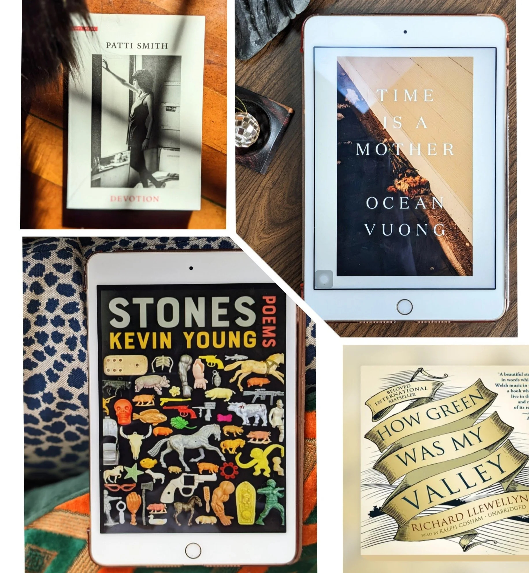 Get the juice in episode 7, featuring a speed-dating round of little reviews: Devotion by Patti Smith (a memoir mashup); Time Is a Mother by Ocean Vuong (<3 <3 <3); How Green Was My Valley by Richard Llewellyn (Welsh miners, gorgeous prose); and Stones by Kevin Young (patterwork poet nonpareil).